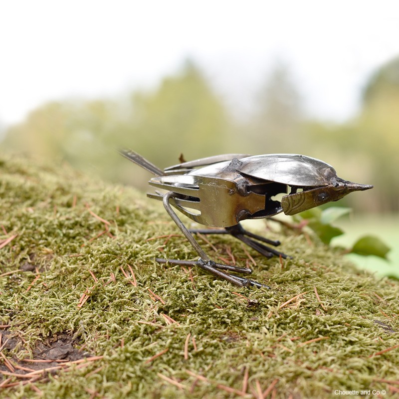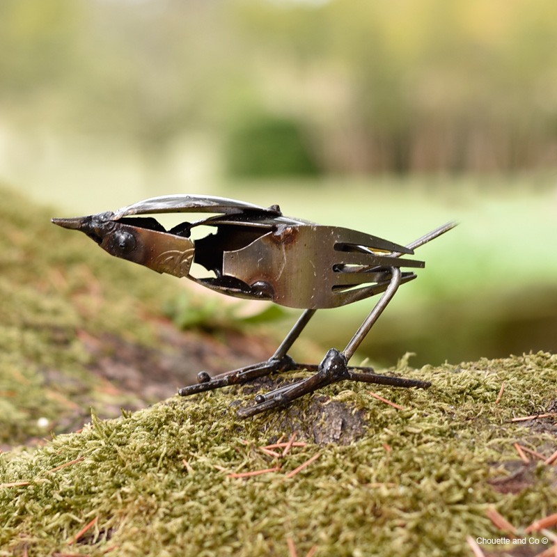 Oiseau mésange en métal recyclé peint à la main hauteur 8cm.