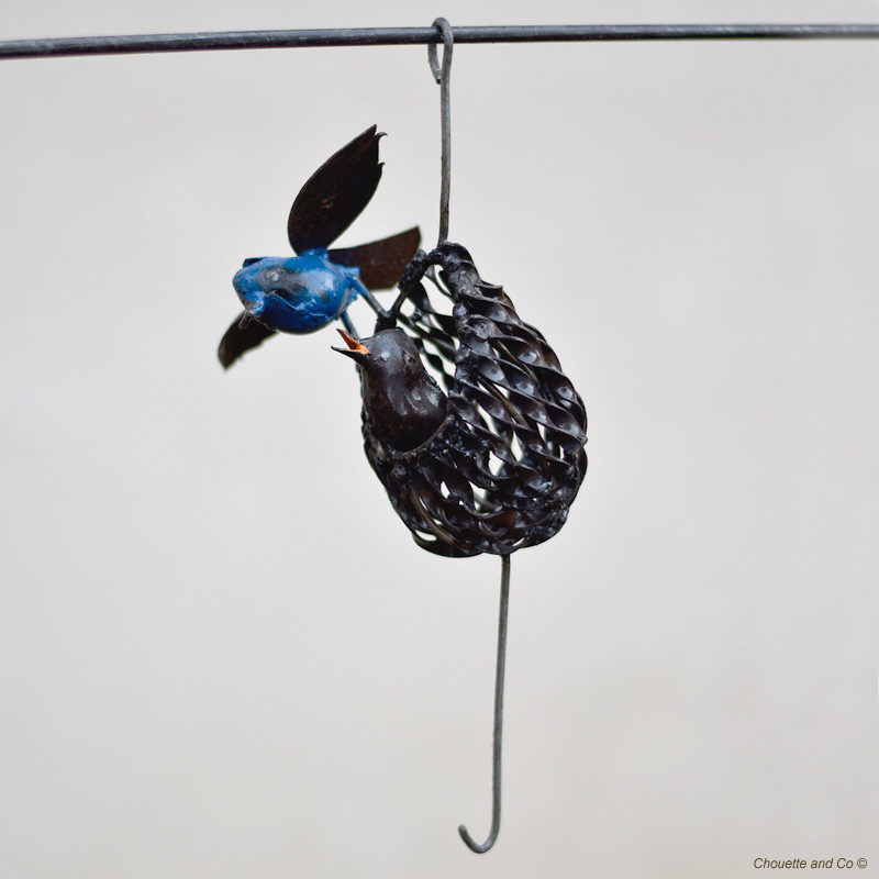 Suspension mangeoire double feuille avec 1 mésange peinte main