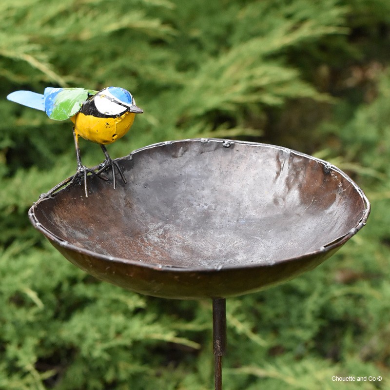 Très grande mangeoire en métal recyclé qui peut contenir beaucoup de graines pour nourir les oiseaux du jardin.