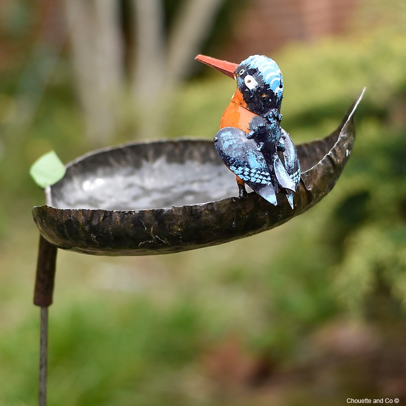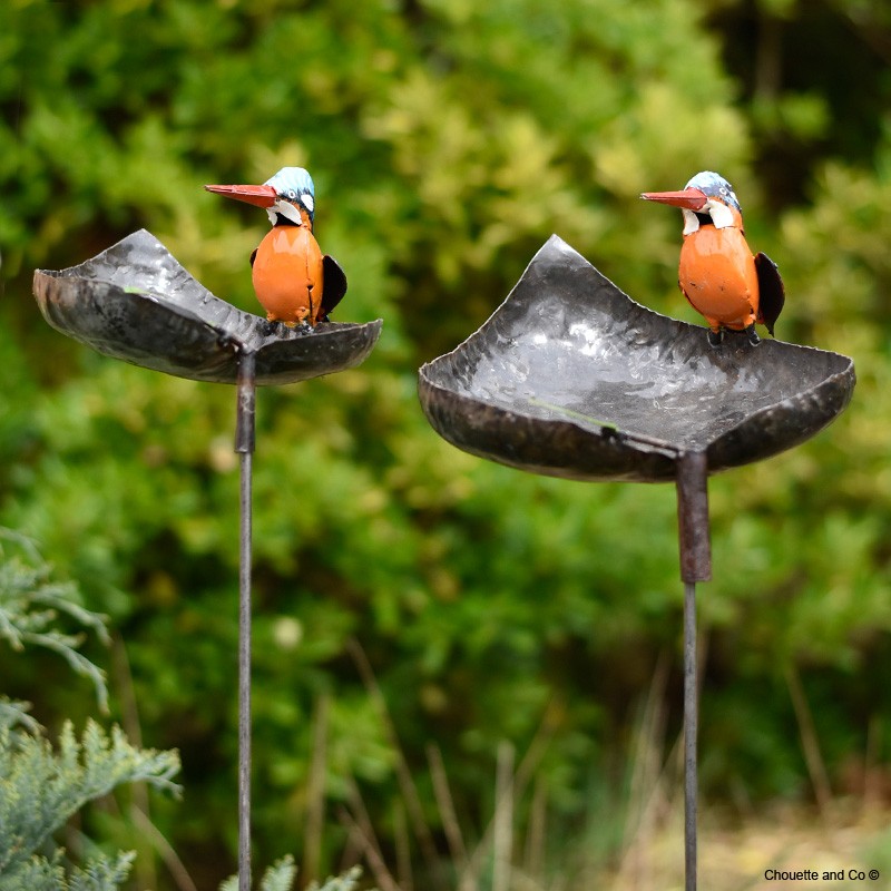 Tuteur mangeoire en forme de coeur avec une feuille et un martin pêcheur, il vous permettra d'attirer les oiseaux pour leur donner à manger ou faire leur bain.